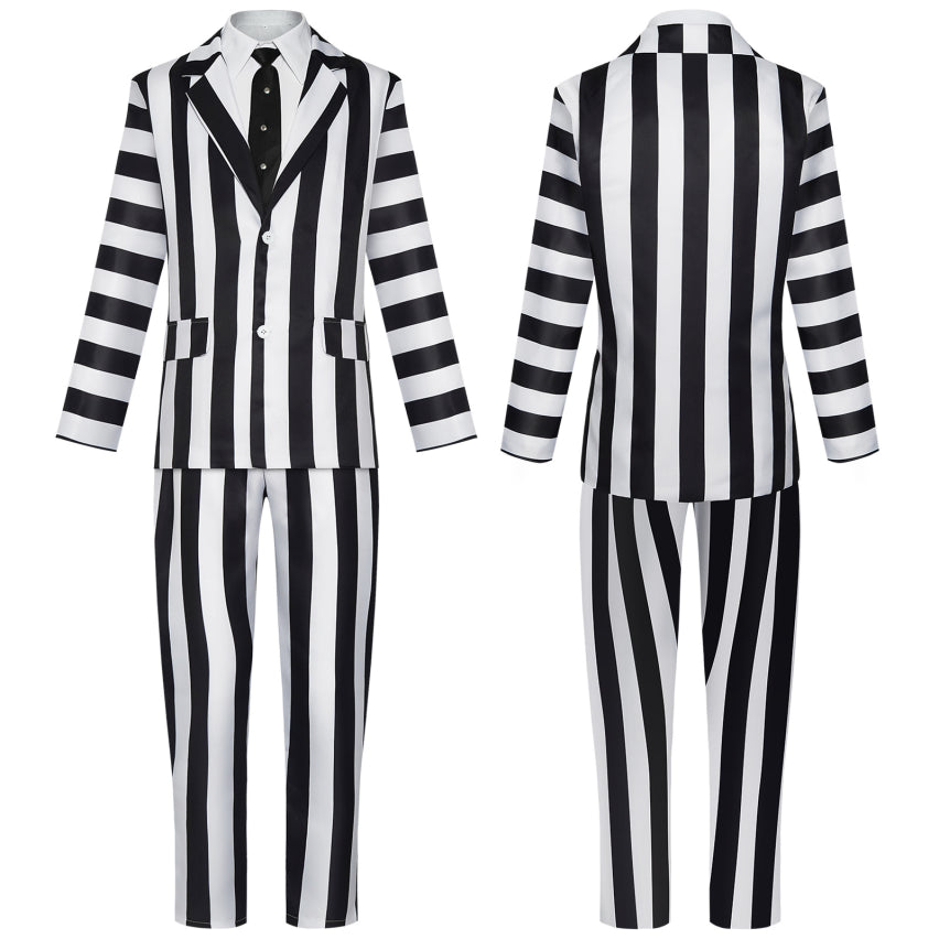 This men’s striped Halloween costume brings cinematic flair to any event with its sharp three-piece design. The set includes a long sleeve jacket, matching trousers, and a tie, creating a coordinated look that instantly grabs attention. Its striking black-and-white pattern makes it ideal for parties, cosplay, or stage performances.