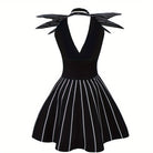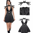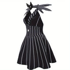 This women’s Halloween costume combines bold stripes with a striking silhouette inspired by gothic character style. The sleeveless cut, halter neckline, and mini length deliver a dramatic look that stands out at any event. Complete with a matching collar accessory, it’s ideal for Halloween parties, cosplay, or themed photo shoots.
