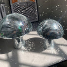 Retro-Inspired Shape: Playful mushroom silhouette enhanced with reflective mosaic detail.