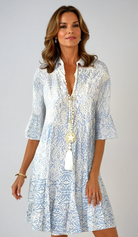 The 3/4 Bell Sleeves Collared V-Neck Flared Printed Dress is a women’s mini outfit designed with a flared silhouette and printed pattern. Its collared V-neck and bell sleeves create a balanced look suitable for casual outings, social plans, or daytime events. Easy to style, it maintains a clean and structured appearance.