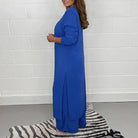 This two-piece outfit delivers a striking visual presence through a refined silhouette and contemporary structure. The combination of a V-neck top and wide-leg trousers creates a confident and stylish appearance that fits naturally into a variety of daily outfits. The coordinated design forms a strong foundation for expressive and polished styling.