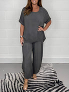This two-piece set features a round neckline top paired with wide leg trousers for a balanced and modern appearance. The short sleeve design and loose cut offers ease of movement while maintaining a defined silhouette. Suitable for everyday wear, casual outings, or laid-back daytime plans.